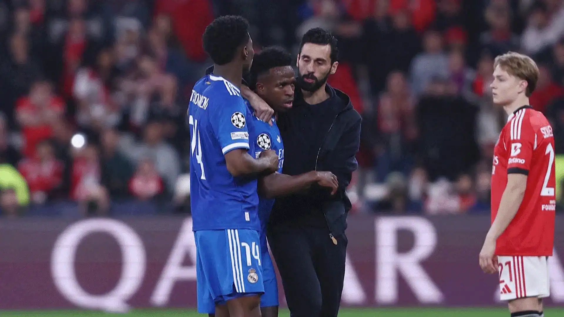 «لقد صُدمت وحزنت عندما شهدت الواقعة العنصرية المزعومة ضد فينيسيوس جونيور خلال مباراة دوري أبطال أوروبا بين بنفيكا وريال مدريد. لا مكان مطلقاً للعنصرية في رياضتنا أو في المجتمع – يجب على جميع الأطراف المعنية اتخاذ إجراءات ومحاسبة المسؤولين. في فيفا، ومن خلال المبادرة العالمية لمكافحة العنصرية ومجلس أصوات اللاعبين، نلتزم بضمان احترام وحماية اللاعبين والحكام والجماهير، واتخاذ التدابير المناسبة كلما وقعت مثل هذه الحوادث. أشيد بالحكم فرانسوا ليتيكسيه لتفعيله بروتوكول مكافحة العنصرية باستخدام إشارة الذراع لإيقاف المباراة وإدارة الموقف. فيفا وكرة القدم يقفان بكل تضامن مع ضحايا العنصرية وكل أشكال التمييز. سأظل أكرر دائماً: لا للعنصرية! لا لأي شكل من أشكال التمييز!»